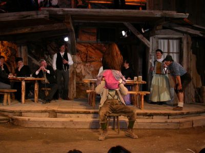 Alois hat sich Alexandra als Siegespreis gewünscht, um sie den Dorfbewohnern zu spendieren, letztlich wird sie Josef zum Spott "spendiert": Der Jäger schaut am Hirsch zua, wia er's tuat mit der Hirschkuah... Bild SG3746 |